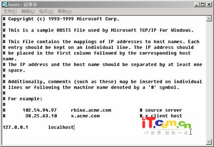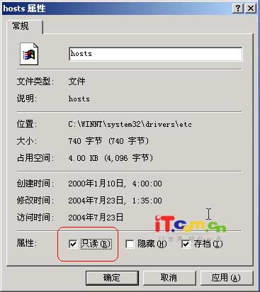 白色框内的就是it世界网站的IP地址,然后在hosts文件中输入以下内容 61.145.121.108 www.it.com.cn 输入完毕后保存,以后再访问it世界网站时,浏览器不会请求DNS解析而是直接调用hosts文件,这样就加快了访问速度。其他网站也可以按照这个方法操作。 2)安全问题 针对windows调用hosts文件的机制,有些病毒会采取修改hosts文件来达到某些目的。因此要注意hosts文件的安全性。除了安装杀毒软件之外,在修改和保存hosts文件后,要给hosts文件加上只读属性,防止病毒修改。 右键单击hosts文件,选择“属性”,弹出属性窗口,在“只读”前面打上勾,按“确定”退出。