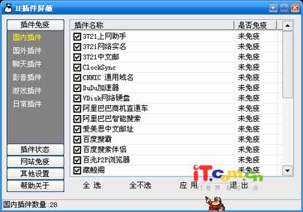 软件简介 软件名称: IE插件屏蔽2005 1.05 点击下载 软件大小: 877K 适用平台: windows全系列 软件性质: 自由软件(可以使用全部功能) 软件介绍: 可以一次性屏蔽所有软件列表中列出的插件,对于已经安装的插件也可以提供卸载功能,目前已经可以屏蔽107个各类插件,还具有网站屏蔽功能,让淘宝网等网页不再弹出。 软件使用 IE插件屏蔽是一款绿色软件,无需安装,直接运行即可。左边共有四个功能菜单。“插件免疫”菜单栏列出了目前常见的插件列表,国内国外和聊天游戏等插件分类很齐全,选择你要屏蔽的插件,按一下“应用”按钮即可。重新运行IE浏览器,浏览网页的时候就不会再被插件所烦恼了。(图1)