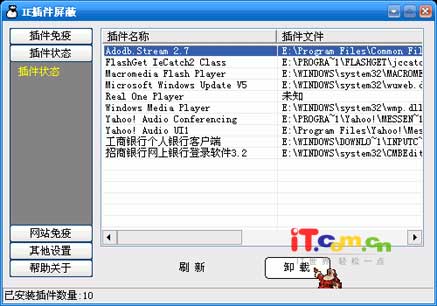 如果你已经安装了你不想要的插件,那也可以用本软件卸载。点击“插件状态”菜单,会列出所有你已经安装的插件,点击你要卸载的插件,按“卸载”按钮即可。(图2)