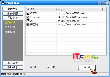 “网站免疫”设置可以阻止一些网页的弹出,比如现在网上大家声讨比较激烈的淘宝网,选择要屏蔽的网页,按“应用”按钮即可。同时软件还提供了病毒检测功能,可以检测出一些流行的恶意木马程序并删除。(图3)“其他设置”中是IE选项和系统管理器,读者可以自行使用。