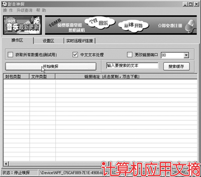 没有看过PCD今年第9期的《偷窥》专题的读者,也许会对“嗅探”这个听起来很专业的技术术语感到陌生。不过,这并不影响大家使用《影音神探》。你只要知道,这个软件会对通过网卡传输的数据进行自动分析,帮你把正在观看的流媒体文件在网络上的真实存放地址查找出来,这就行了。软件的使用是非常简单的。