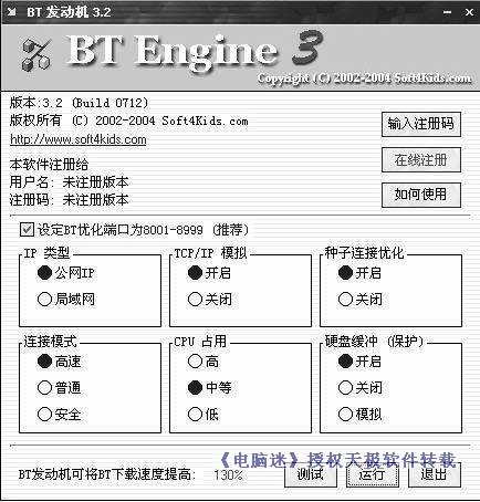 注意:BT发动机仅仅是网络优化软件,它不具有下载功能,必须配合Bitcomet等BT下载软件运行。
