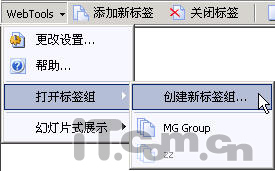 3.Webtools允许定义标签组,一次点击就可以打开多个事先指定的网页。点击插件栏上的Webtools按钮,在“打开标签组”下的子菜单中选择“创建新标签组”,然后在弹出的窗口中输入该标签组的名称。(图2)