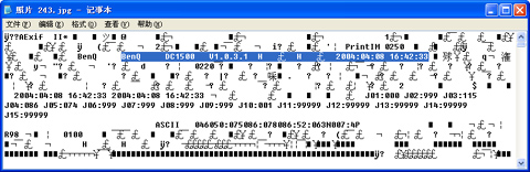 首先介绍最愚笨同时也是最简单的方法。用记事本直接打开一张JPG格式的数码相片(从“打开方式”中选择记事本程序即可),你看到什么了?不就是一堆密密麻麻的乱字符(如图1)。别急,请再仔细观察图中笔者用阴影标注的部分,即“BenQDC1500”和“2004:04:0816:42:33”,这些就是记事本可直接读取的Exif信息。由此我们不难看出,拍摄这张相片的数码相机品牌是BenQ,具体型号是DC1500,并且拍摄的具体时间是“2004:04:0816:42:33”。