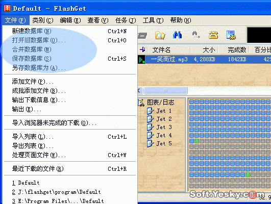小提示: FlashGet 的数据库名为 Default.jcd ,默认存放在 FlashGet 的安装目录中,使用第一个方法后会导致 FlashGet 将以后的文件下载信息也存储到桌面的数据库文件中来,万一桌面数据库文件被意外删除,将非常不利于我们工作,所以,才需要进行数据库回存操作。