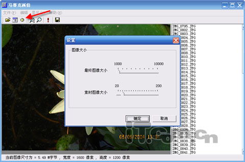 然后就是调整最终图像和素材图像各自的尺寸,点击工具栏上的“设置”按钮,在弹出的对话框中拖动滑条来进行调节。(图3)
