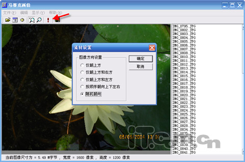 最后就是开始制作了,点击工具栏上的感叹号按钮,在弹出的素材设置窗口设置一下小图片的方向,这个可以根据自己的需要进行设置,如这里就选择了“随机朝向”,点击“确定”按钮就可以制作了。(图4)