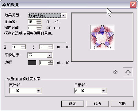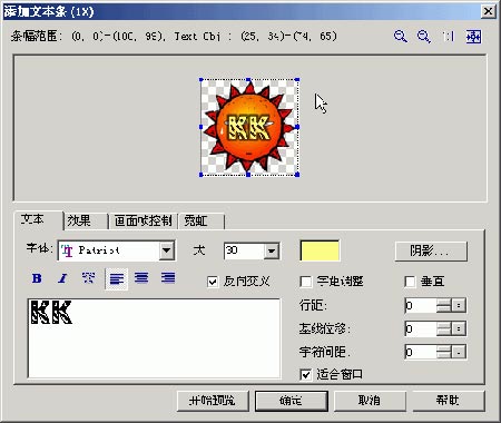 5、然后把样本字样改成自己想写的字。 6、用鼠标把字移动到适当的位置。 7、选择特效。选效果一项。(我选择的是进入场景时:水平合并,退出场景时:顶部滚动) 8、保存。选另存为>GIF文件。这样就OK了~