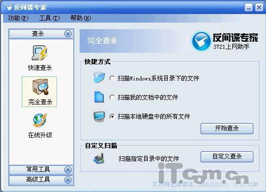 上网助手之反间谍专家(以下简称反间谍专家)为我们提供了两种查杀间谍软件的方法,一种是快速查杀,一种是完全查杀,其两者的区别只是查杀范围的不同,快速查杀只是针对会对恶意程序利用的薄弱环节进行扫描,并且迅速查杀其中的恶意程序,保护用户的隐私与安全(如图1所示).