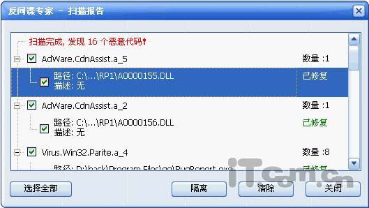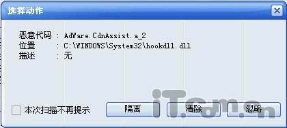 可以从隔离、清除、忽略三种方式中选择对恶意程序的处理办法,如果以后不想再弹出提示窗口,只要选中窗口中的“本次扫描不再提示”,然后再次确定一下就可以了。在查杀完成后就会出现一份扫描清单,在这里可以看到恶意程序名称及存在数量与具体位置,同时显示病毒的存在状态(如图6所示)。