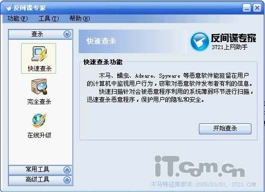 现在网络上的病毒、木马、恶意程序日益增多,同时间谍软件也会不声不响的进入你的电脑中安家落户,间谍软件因其隐蔽性强的原因,往往在不知不觉中盗取用户电脑中的资料,另外还可能会破坏你的系统或是降低系统的运行速度。为此3721公司于前些天推出了一款完全免费且功能强大的“上网助手反间谍专间”的反间谍程序,这款软件致力于检测且清除系统中的间谍程序,同时还可以对系统进行免疫,保护系统不受间谍程序及木马的破坏,另外如果你对电脑比较熟悉的话,还可以通过三款强大的高级工具对系统进行彻底的清查,让间谍程序无处遁身。笔者试用了几天,感觉其功能强大,下面就让笔者带领大家一起来看一下试用过程,让大家也体味一下这款功能强大的反间谍软件。