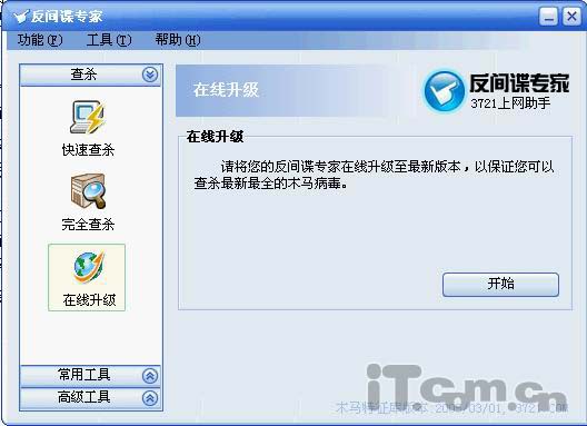 另外为保证反间谍专家信息库最新,软件还提供了在线更新的功能,点击查杀功能项里的在线升级功能来进行升级(如图7所示),以保证能够查杀最新最全的木马病毒。