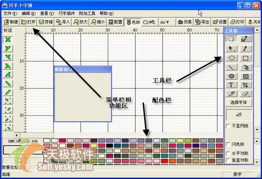 左侧部分是针法工具,上侧为一些在实际使用时的功能按钮,右侧的是供编辑绣图的工具,这十分像Photoshop的工具栏。下侧是配线栏,不同种类的颜色在此显示。中间则是画布区域。