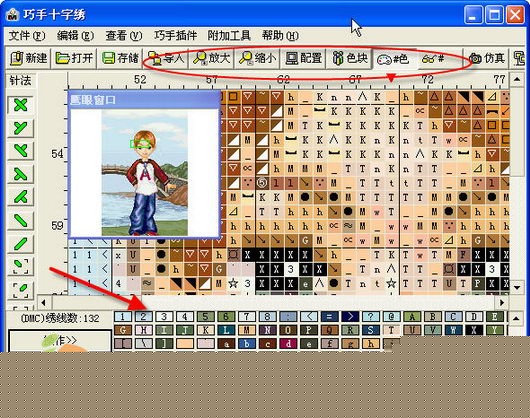 在主窗口中可以看到,转换后的绣图文件已经生成,不同的颜色以不同的字母在下方对应显示。我们可以根据需要进行色彩的改换与修正。这里面有几个工具是经常要用到的(图3):
