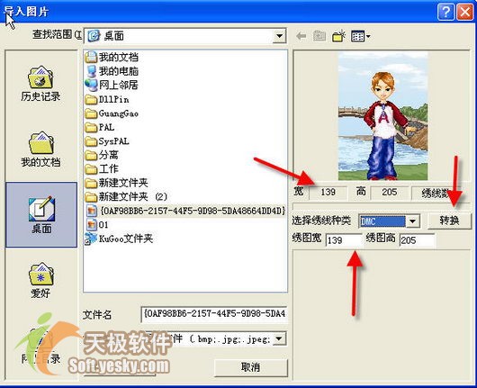 依次选择图片,预览图会出现在右侧,并且显示图片的高与宽,下侧还有线图宽与高,在这里您可以根据需要进行修改,软件会自动按照比例缩放。在绣线中选择“DMC”,并单击“转换”进行转换。之后单击下方“打开”,软件会将转换后的绣图直接显示在主窗口中。