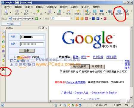 2、使用浏览器登陆QQ聊天、挂机   单击工具栏上的“侧边栏”按钮,打开侧边工具栏。然后单击最下面的qqmax图标,打开登录界面(如图2),输入用户名和密码后,单击“登录”按钮登录QQ。