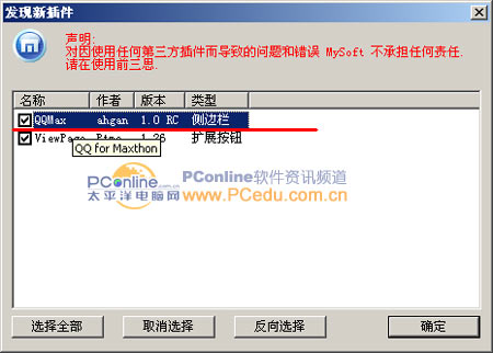 提到QQ可能没有人不知道吧!那你听说过QQmax吗?它是某位牛人专门为maxthon浏览器软件编写的一个插件程序,通过它,我们就可以用maxthon浏览器来登陆QQ聊天、挂机了!这还不算,其实它还有别的玩法哦,赶紧跟我来试试吧!      软件大小:610 KB   软件语言:中文   [点击下载]   一、浏览器里的QQ   1、安装Maxthon和QQmax插件   双击maxthon(即MYIE2)安装程序,按提示一路单击“下一步”安装好这款浏览器软件。解压缩QQmax这个插件程序,然后把QQMAX这个文件夹复制到maxthon安装目录的“Plugin”文件夹下,启动maxthon浏览器,弹出发现插件对话框(如图1),选中“qqmax”插件单击“确定”按钮,打开浏览器主界面。
