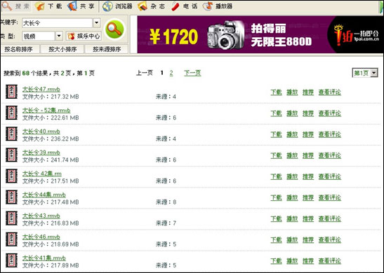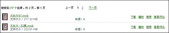 POCO2005的搜索功能可为之“明、快、精、简“。搜索结果直接以网页的形式呈现,搜索结果以每页50个结果显示,每个文件还同时提供了四个执行操作:“下载”、“播放”、“推荐”、“查看评论”。真正地实现POCO2005搜索功能的“明白、快捷、精确、简单”。
