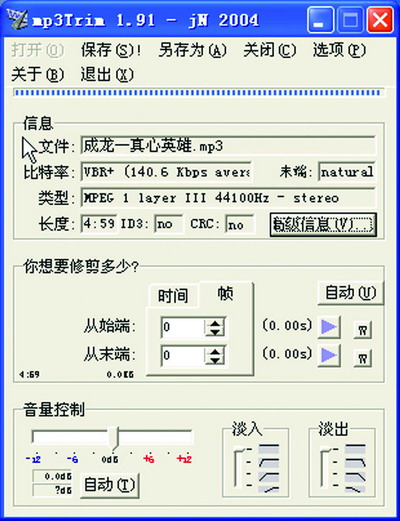 Mp3Trim的汉化版已经改为了绿色软件,只有一个文件。用它打开需要编辑的MP3文件,首先看到是MP3的相关信息(图1),如MP3的类型、长度、比特率等信息。由于我们需要去除文件的爆音,只需将含有爆音的那部分切掉就可以了。