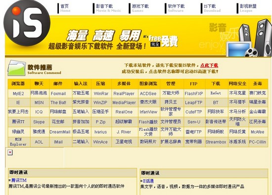 在IS的主页www.52s.cn里我们可以清晰看到里面分开了影音、游戏、软件,三大下载专栏。三大专栏各有所长,海量资源只等你来分享。在电影专栏里,现有400多部电影等你分享;音乐专栏,现有300集音乐专集;游戏专栏,现有几百部热门游戏;在软件下载专栏里,软件资源更是无穷无尽、应有尽有,只要你想找的都基本可以满足。