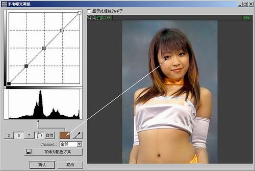 曝光问题解决了?慢着,这个调整结果看上去比较‘雾’,所谓‘雾感’一般来说是由于图像中对比度没有达到想象的程度而造成的,在这个调整结果中,头发发白,因此显得该黑的地方不黑,看起来就有‘雾感’了。正好,这里要介绍Turbo Photo提供的更高级的调整方法——手动曝光调整。 从曝光按钮旁边的下拉菜单中进入手动曝光调整功能。这个功能相当于Photo Shop里面的Level命令加Curve命令,本来就是,这两个命令其实原理统统一样,不明白PS为什么要分开,反而让用户不明白。Level命令其实就是直线化的3点Curve命令。 分析直方图看见,直方图现在的确是抵满了0-255整个横坐标,这就是为什么刚才的自动色阶等调整不起作用的原因。 现在,我们的任务是,利用手动曝光调整,将头发部分恢复到正常的曝光。我们已知,脸部的曝光基本符合要求了,因此,这次调整最好不要影响到脸部的曝光。如何做到呢?我们用吸管吸取连部最暗部分的颜色,这时候在左边的直方图上,一个小箭头给出了参考,只要保持这个肩头所指位置以上的部分曲线不变,那么就不会影响到相对较亮的脸部。然后,选取5点调整。一般来说,如果你想调整亮度,或者作类似Level的操作,选择3点调整。如果像调整对比度,一般选用5点的工具,可以分别对低调、中调和高调部分作调整。7点工具则是用来完整更细微的细节调整的。 图4, 用吸管工具得到连部最暗部分颜色在直方图上的位置