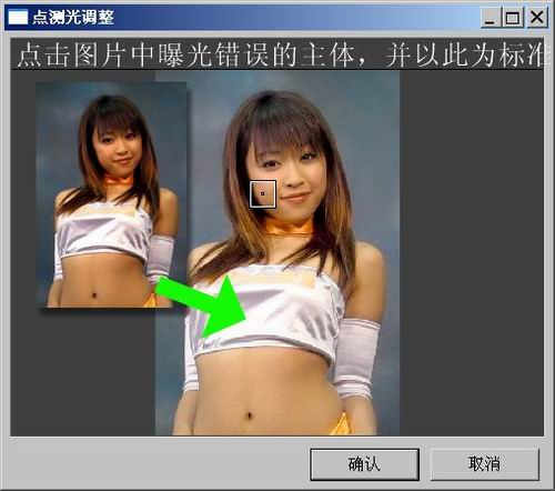 既然是照相时测光的问题,在Turbo Photo里面可以用点测光来重新调整。第二种方法就是点测光。直接对准脸部较暗部分一点,立刻图像就亮堂了许多。 图3,点击脸部较暗部分,调整图像亮度