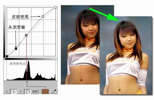 提供参考亮度则是Turbo Photo有别于PS的一个长处。它可以直观地把图像中某个区域在直方图中的位置联系起来,作为调整的依据。 拖动中间的一个控制点到肩头所指的参考亮度处,同时保持参考亮度以上部分保持斜线不变。拖动左边的一个控制点朝下,表示压低参考点以下的亮度值,我们看到,头发的亮度随之变黑。调整到满意的亮度后,松开鼠标。 一般来说,让MM的皮肤稍微过曝一点可以显得更白(看个人喜好了)。因此,我这里就擅作主张调整了一下,把参考点以上的曲线包括参考点适当的向上提,最后得到了这样的曲线和结果。 对比刚开始的图像,是否觉得改观较大?是的,曝光调整的确是能对图像面貌改变最多的调整。 图5,调整后的曲线以及和最初效果的比较