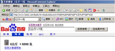 作为中国老百姓,对某些公制单位总是不太习惯,尤其是老外最喜欢用的英制单位,在我们的大脑里总也建立不起这个概念。1英尺到底有多长,用手比划来比划去,总也比划不出一个大概,最后还得转换成自己熟悉的单位才知道1英尺到底有多长。但是,一时间要找到一个单位转换工具,还真不是件很容易的事。 不过现在好了,有了搜霸了,直接在搜索栏内输入你想要换算的表达式,回车后便得结果。例如您要换算5公斤等于多少克,照下图输入“5公斤=?克”,回车,看到结果了吧。