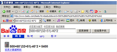 对电脑依赖久了,在计算方面人们似乎变得越来越“笨”了。一个简单的加减法,也会用鼠标点开“计算器”程序,又是数字,又是运算符,操作起来好不麻烦。由于微软“计算器”在操作过程中并不显示计算公式,稍有不慎计算结果还可能出错。 现在试试百度搜霸的计算器功能吧,把您要计算的公式直接输在搜索栏内,按下回车键或点击“搜索”,一步便可得出结果。由于计算公式显于屏上,用户可以方便地查看公式正误。这样,计算结果出错的可能性就除为了零,比起系统提供的“计算器”方便快捷多了。 当然,为了让您能够准确无误地输入公式,您最好还是先看一下百度计算器帮助,这样她才能真正成为您的得力助手。例如,如果您要计算500+60*(32+51)-40*2,在搜霸搜索栏直接输入,回车后,便会得出如下图结果。