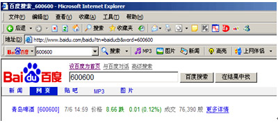 1] 查询股票信息 投身股海的朋友,股票的涨跌就是他的第一信息需求,随时随地得知自己股票的价格,这可是他梦寐以求的事啊。有了百度搜霸,保你梦想成真。 不需要安装专业的股票软件,更谈不上收取软件注册费,只要在搜霸的搜索栏里输入您的股票代码(什么?代码忘记了!,那你还炒什么股啊,回家卖红薯算了),轻点鼠标或按下回车键,股票信息已跃然屏上!只要有网络,您便可Any Time Any Where,方便吧。 以“青岛啤酒”为例,在搜霸搜索栏内输入股票代码600600,鼠标轻轻点击“搜索”,“青岛啤酒”便会出现在头版头条,就是这么简单(见下图)。