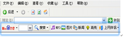 使用百度搜霸之前,首先要进行安装,这样她才会在你的IE中安家(下载地址http://dlbe.it.com.cn/softweb/software/network/searching/20056//11973.html)。安装好后的百度搜霸如下图浅蓝色方框所示。