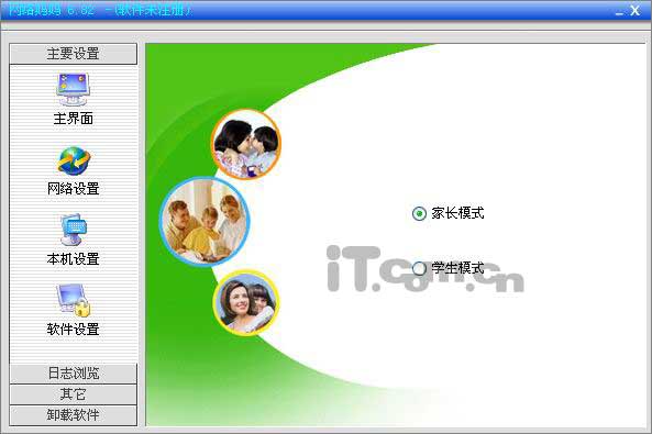 网络妈妈实际上是一款软件,该软件非常人性化,可以在后台隐蔽运行,在开始菜单、桌面甚至是添加删除程序里都看不到该程序的痕迹,这样软件就不易被发现或是中止。如果我们想对软件进行设置,只要按下调用码(软件默认调用码为:99887766)就可以调出控制平台,随时对软件进行设置。同时该软件分为“家长模式”与“学生模式”(如图1所示),这样在家长使用电脑时,只要使用家长模式就可以不受任何限制,使用非常方便。另外该软件虽然功能强大,但使用简单,如果家长对电脑不熟悉,只要安装软件而无需改变设置也可以很好的管理你的电脑。