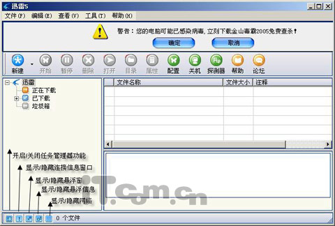 另外笔者第一次使用迅雷5的时候,发现原来的任务管理器不见了,难道在新版本的迅雷中把方便实用的任务管理器给去掉了?其实在软件主界面的左下方有一组按钮,这些按钮用来控制显示或是隐藏任务管理器、悬浮窗口、网络线等等(如图2所示),点击相应的按钮,来打开或是关闭其实能,非常方便实用。