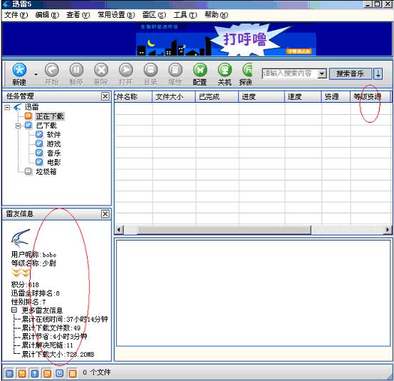 迅雷5正式版提供了会员和等级服务(如下图所示),当你经过简单注册成为迅雷会员后,可以获得免费会员服务,在使用迅雷下载的时候会获得一定的积分,在线时间和下载文件数量决定了你在迅雷积分的多少,随着积分的增加你的等级和全球排名也会改变,如最开始是“列兵”,最高等级是“三军统帅”等等,哈哈,资深用户是不是很有成就感哦?而且随着等级的提高,会相应的增加等级资源,例如迅雷在下载时最多返回40个资源,当一个迅雷会员是8级的时候,相应的等级资源为8,每次下载时最多就能返回48个资源,不同的等级,待遇可是不同哦。还有,本次迅雷5正式版,当你正式成为会员后,迅雷还会记录你下载了多少文件、帮你节省了多少时间、帮你解决了多少死链等信息,多好的一个工作秘书啊,而且还是免费的,爽吧!