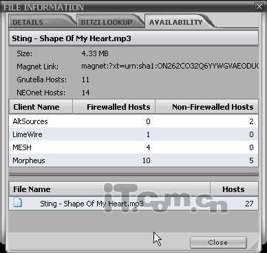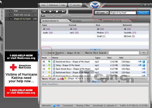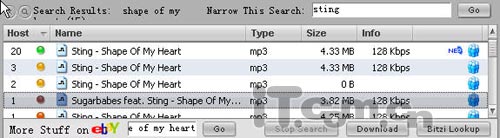在搜索结果列表上有“Narrow This Search”一栏,即缩小搜索范围。相当于google、baidu等搜索引擎上的“从结果中再搜索”所起的功能。比方说,我最初搜索的关键字为“shape of my heart”,文件类型为Audio,则搜索出的结果为所有名为“shape of my heart”的歌曲,我再往“Narrow This Search”一栏中输入关键字“sting”,则会在刚才的搜索结果中搜索出sting演唱的shape of my heart歌曲。当搜索结果条目比较多的话,使用这个功能可以让你更精确的找到你所需要的结果。