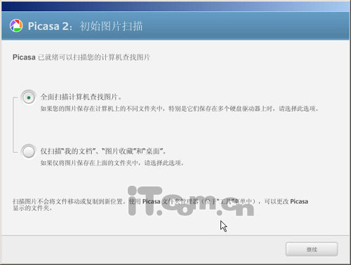 第一次运行Picasa时会提示你扫描硬盘上的图片文件,这里有两个选项,一是扫描整个硬盘上的图片,二是只扫描我的文档、图片和桌面上的图片文件。(图1)要注意的是Picasa也会扫描avi格式的视频文件,如果你的图片文件都固定放在几个文件夹里的话,那可以选择第二个选项,进入Picasa主界面后可以再重新扫描你指定的文件夹,免得将视频文件也归入Picasa内。如果你的图片分散在硬盘各个分区内,可以选择第一个选项,说不定会帮你找到一些你已经遗忘的老照片哦。