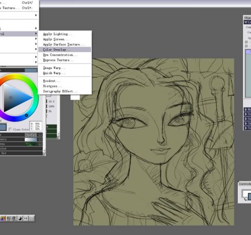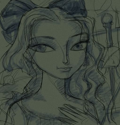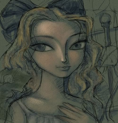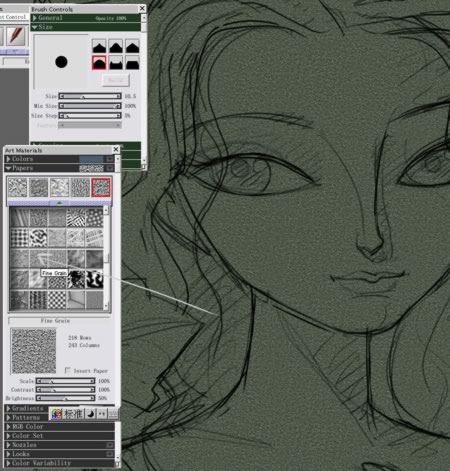5.现在我们把图形保存,然后在painter6.0里继续,通常我使用多个软件来绘制一幅作品,因为这些工具各具他们的优点,我使用 dry media 工具里的oil pastellai 来绘制女孩的肤色和光感,头发的表现我使用了变量的brush工具来绘制,这些自设的笔触需要你自己去不断的实验。