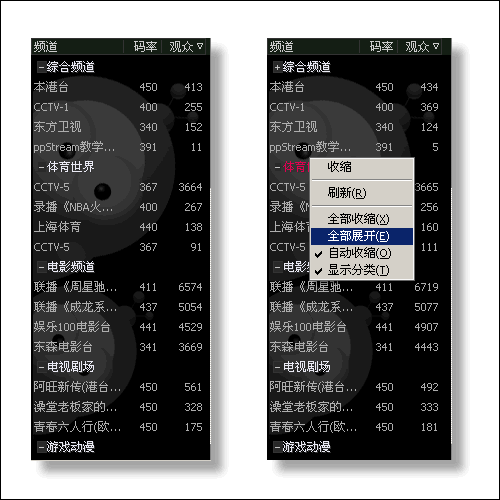 另外在“显示分类”状态下还可以选择节目列表的“全部展开”、“全部收缩”、“自动收缩”(点开一个分类后自动把其他分类收缩起来)模式,充分考虑到了网友不同的喜好。