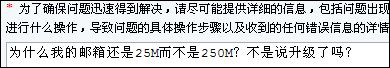 b:为了确保问题迅速得到解决,请尽可能提供详细的信息,包括问题出现的日期和时间,当时试图进行什么操作,导致问题的具体操作步骤以及收到的任何错误信息的详情。注意:下面请填写“为什么我的邮箱还是25M而不是250M?不是说升级了吗?”