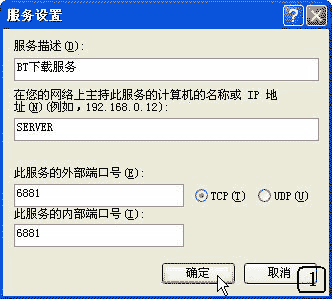 在该服务设置窗口中,"服务描述"一栏中是对该网络服务的描述,可随便填入就可以(如"BT下载服务"),"在您的网络上主持此服务的计算机的名称或IP地址"栏中是要填入要进行BT下载机器的IP地址或机器名称(如我的机器名是SERVER),"此服务器的外部端口号"中填写6881,"此服务器的外部端口号"中也填写6881,当然,可别忘了选中TCP协议然后按,然后点击"确定"按钮即可。