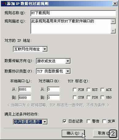 在"规则名称"栏中填入此规则的名称(如BT下载规则);"规则描述"一栏则是在此填写对这一规则的详细描述,可以不用填写;在"对方的IP地址"中选择"互联网任何地址";"数据传输方向"请选择"接收或发送";"数据协议类型"一栏中当然选择"TCP 类型数据包";在"本地端口"中填写从6881到6889,这样我们就指定了BT下载软件所使用的所有端口,而不用单独一个个去设置。要注意的是,在下面"满足上述条件时动作"选项中,我们一定要选择"允许数据包通行"的值,否则是拦截数据包和继续下一条规则,那都不是我们所希望的。其他的所有选项都可选择默认值即可,完成后点击"确认"就行了。
