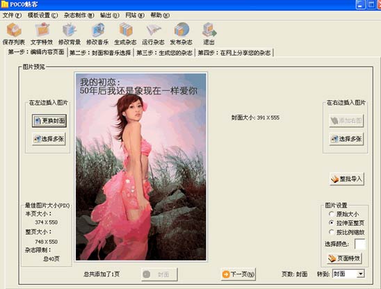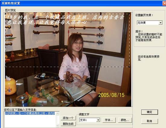 使用上很简单的一款软件,自己摸索着就把作品完成了,但是生成的相册界面很美观,看来是翻页模板做得好。还有个有趣的功能就是可以添加页面特效( 按钮中设置),可以添加文字、动画效果。