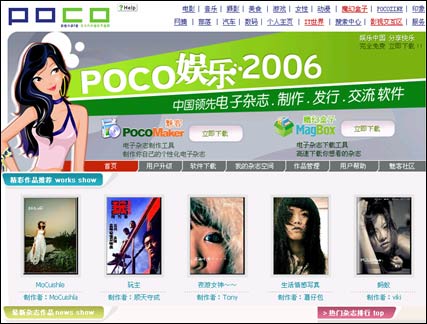 PocoMaker 魅客是通过网站+软件的方式提供电子杂志、相册制作、发布等服务的。PocoMaker软件是一款免费提供的电子相册制作工具(可以在http://maker.poco.cn下载),通过几个简单的步骤制作出完整的杂志文件,软件中还结合上传发布的功能,很轻松就能在网上分享你的作品。http://maker.poco.cn 则是专门用于PocoMaker 魅客作品展示的频道,所有上传后审核通过的作品都会在上面出现。而提供的下载方式也很特别,采用POCO软件和MAGBOX软件的P2P下载方式,点击下载地址前需要先运行相关的软件(POCO和MAGBOX都是广州数联开发的软件,有着大量的用户群)。