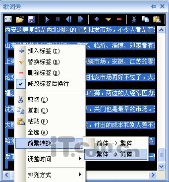 如果你有一些文字想转换成繁体或者简体,也可以通过千千静听来搞定,方法很简单,先把要转换的文字都保存在一个文本文件中,接着在“歌词秀”面板中点击鼠标右键,选择“编辑歌词”把文件导入,在编辑框中按“Ctrl+A”来全部选中导入的文字,然后点击鼠标右键选择“简繁转换-繁体(或简体)”就可以了(如图2)。