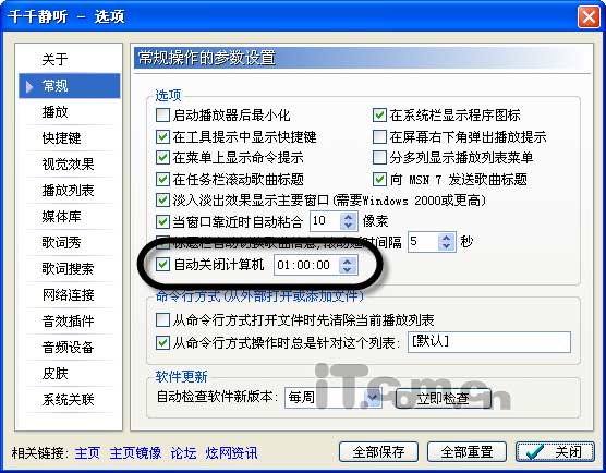 右键点击千千静音的空白处来选择“选项”,点击“常规”标签,接着把右面的“自动关闭计算机”选中,在后面设置一下要定时关机的时间就可以了。