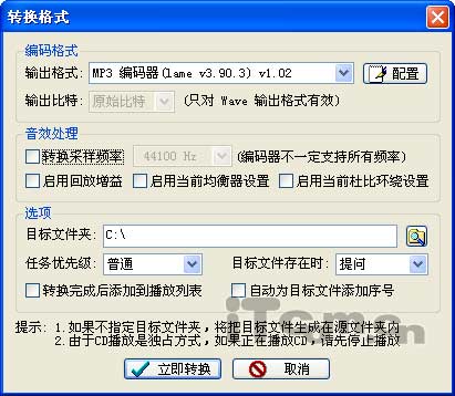 转换的方法很简单,在播放列表中右键点击要转换的歌曲文件,在弹出的菜单中选择“转换格式”,接着在窗口的“输出格式”中选择“MP3编码器”(或WMA),还可以通过“配置”按钮对歌曲的比特率等其他参数进行设置,然后在下面选中一个输出文件夹,选好后点击“立即转换”按钮就可以转换歌曲了。如果想批量转换的话,可以在播放列表中一次选择多个歌曲文件进行转换(如图1)。