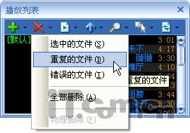 下载的歌曲一多,难免就会有重复的,但是手工查找太麻烦了,那就用千千静听来帮你清理吧。先把电脑里面的歌曲都添加到播放列表中,接着点击工具栏上“删除”按钮下的“重复的文件”就可以把重复的歌曲删除掉了(如图4)。