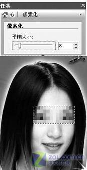 用SnagIt打开图片后,先用鼠标选取要添加马赛克的区域,然后点击“效果/图像处理/像素化”选项,会弹出“像素化”任务窗口,然后向右拖动“平铺大小”滑块,就会看到选取的区域上出现了马赛克效果,最后将滑块拖到合适的位置即可(如图1)。