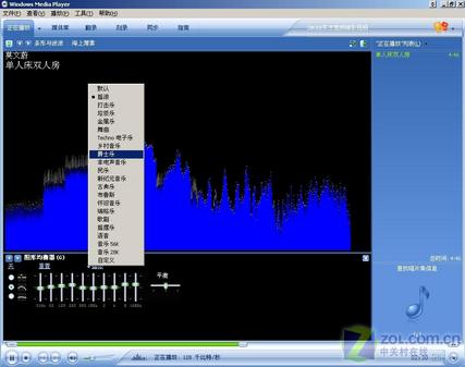 现在,声卡和多媒体音箱已成为电脑的标准配置。如果将上面提到的叫做硬EQ,那么电脑音乐播放器中的均衡器就可称为软EQ,它用软件(程序)来实现各频段的分离和随意增减。图1就是大家见得最多的Windows Media Player的EQ面板图(图1)。显然,它能将音乐分为31Hz、62Hz……1KHz……16KHz,共10段。向上拖动某一滑块就提升对应频率的音乐,向下拖则是衰减。