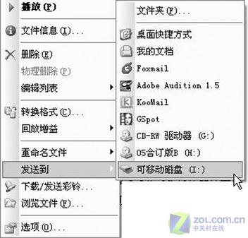 有时我们需要对音乐文件进行试听,然后再拷贝到MP3机中。用“千千静听”播放器就可以一步搞定,在用“千千静听”试听音乐文件时,用右键单击要拷贝的文件选择“发送到/可移动磁盘”选项即可完成拷贝。